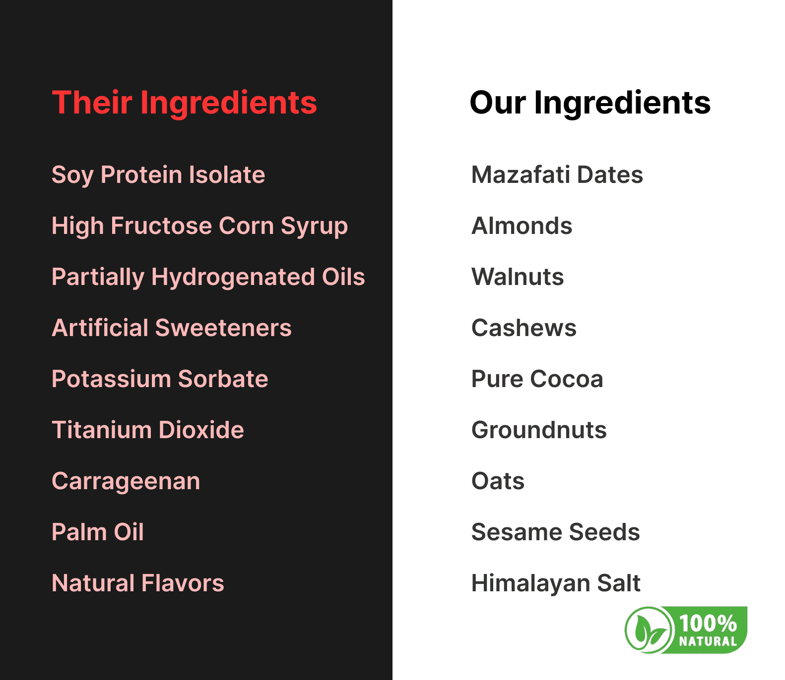 It means no hidden junk. We will never use syrups, refined sugars, or artificial sweeteners. Our sweetness comes from one place: premium, whole Mazafati dates.
